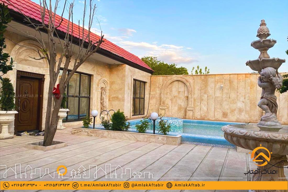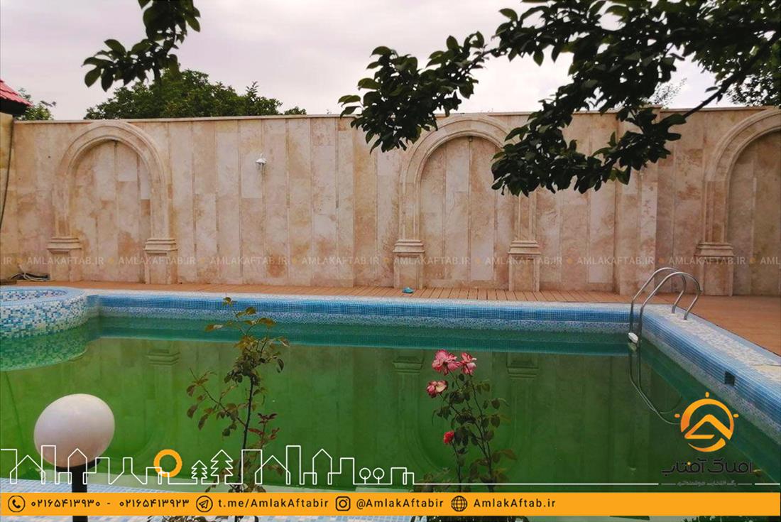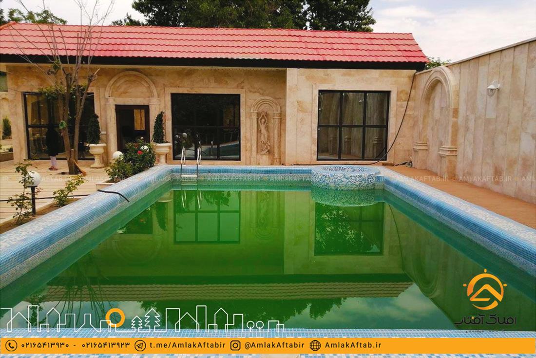 این باغ ویلا دارای انشعابات کامل و قانونی ، سند به صورت وکالت از سند مادر و همچنین نامه جهاد کشاورزی نیز برای این ملک دریافت شده است. در محوطه باغ نیز استخر چهار فصل این باغ ویلا قرار گرفته که دارای تجهیزات کامل و تصفیه خانه نیز می باشد. از دیگر امکانات رفاهی این باغ ویلا می توان به آلاچیق بزرگ و بسیار زیبا اشاره کرد که دور تا دور آن محوطه سازی شده است. در مجاورت آلاچیق یک آب نمای زیبا نیز قرار گرفته که بهمراه محوطه سازی و نورپردازی انجام شده، جلوه بسیار زیبایی به فضای باغ داده است.
