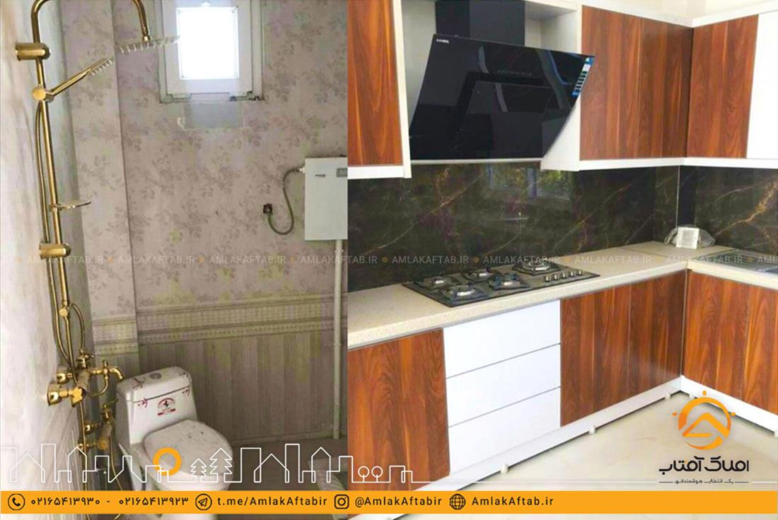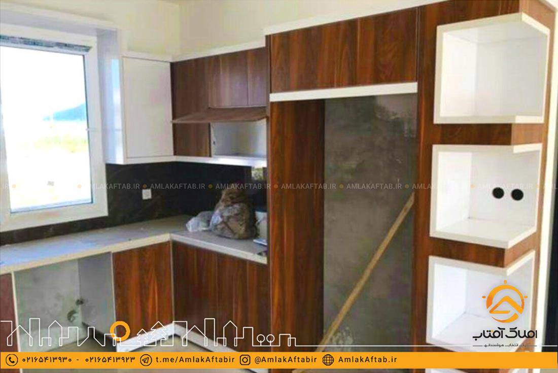 - کابینت هایگلاس ،کف سرامیک و نما سنگ