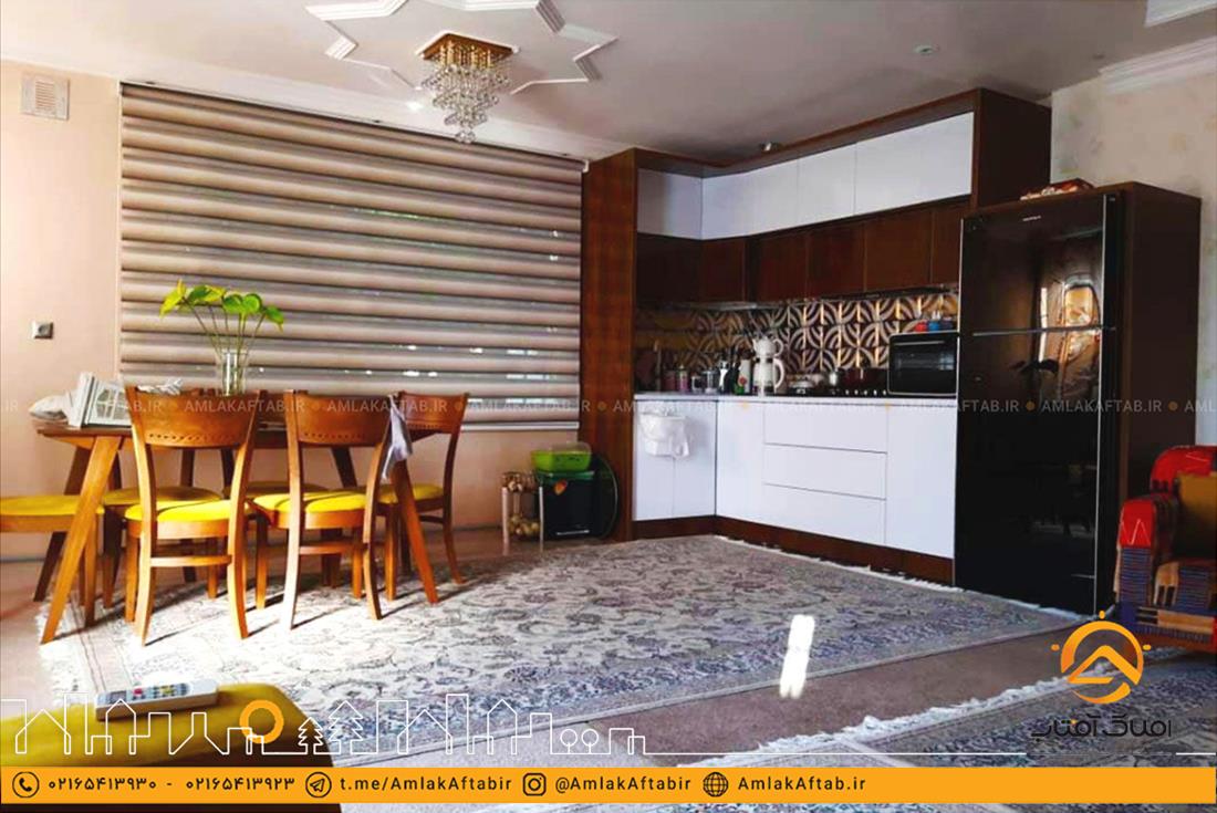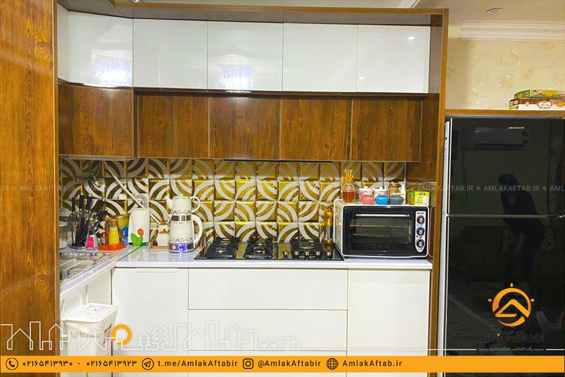 - کابینت هایگلاس، کف pvc و نما سنگ تراورتن