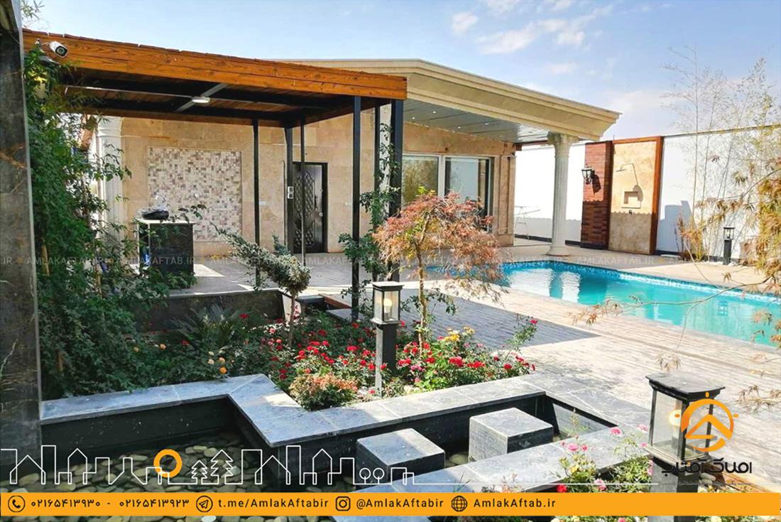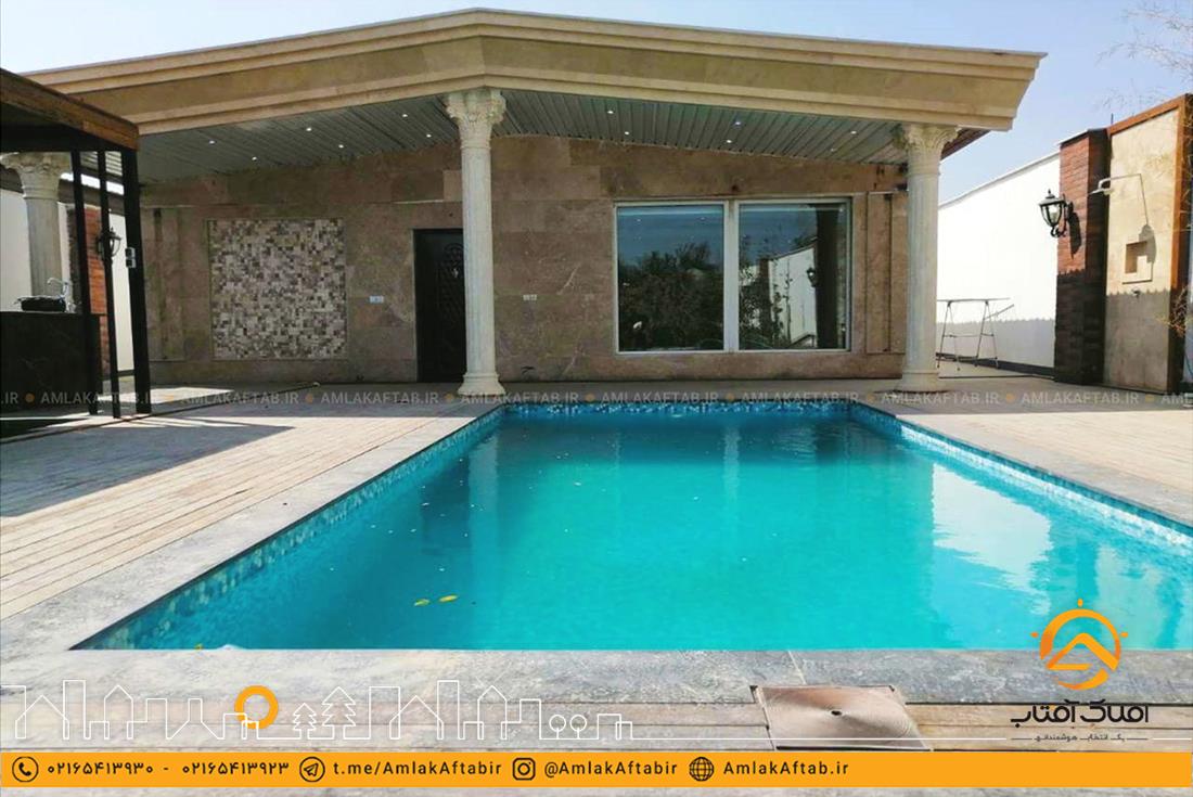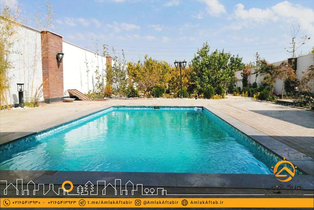 این باغ ویلا لوکس دارای استخر با تاسیسات کامل از جمله تصفیه خانه نیز می باشد که در مجاورت ویلا ساخته شده و کف محوطه اطراف آن از جنس چوب می باشد. از دیگر امکانات این ملک می توان به آلاچیق ، آب نما بسیار زیبا و همچنین باربیکیو اشاره کرد. همچنین این باغ ویلا در ملارد دارای نگهبانی 24 ساعته نیز می باشد که همین موضوع باعث بالا رفتن امنیت این ملک شده است.