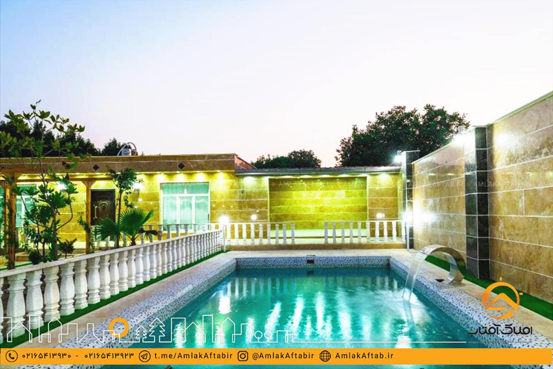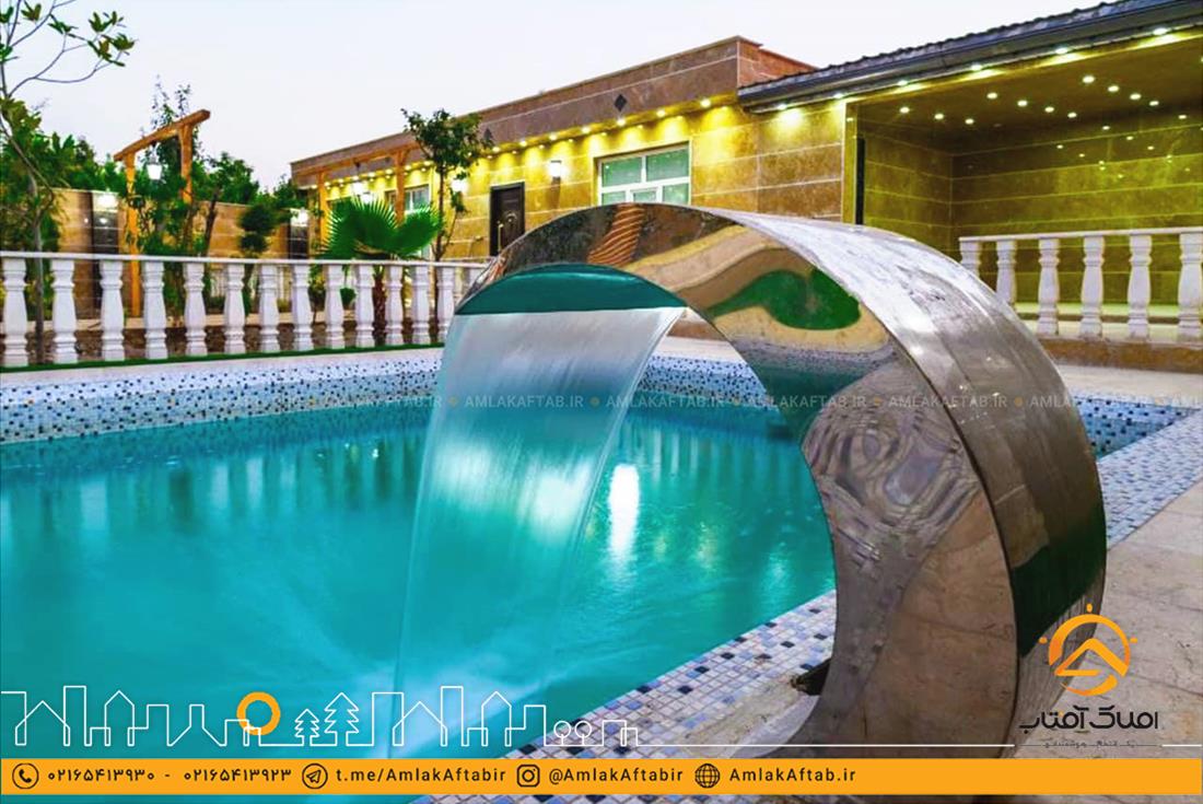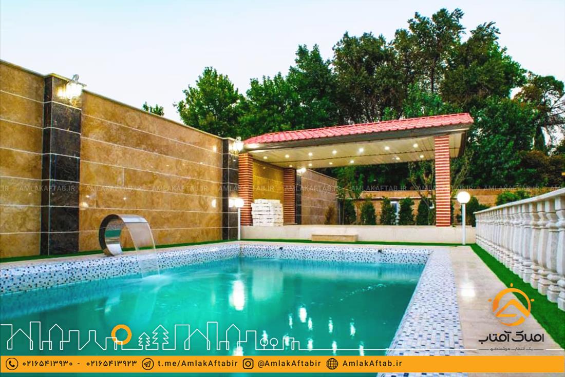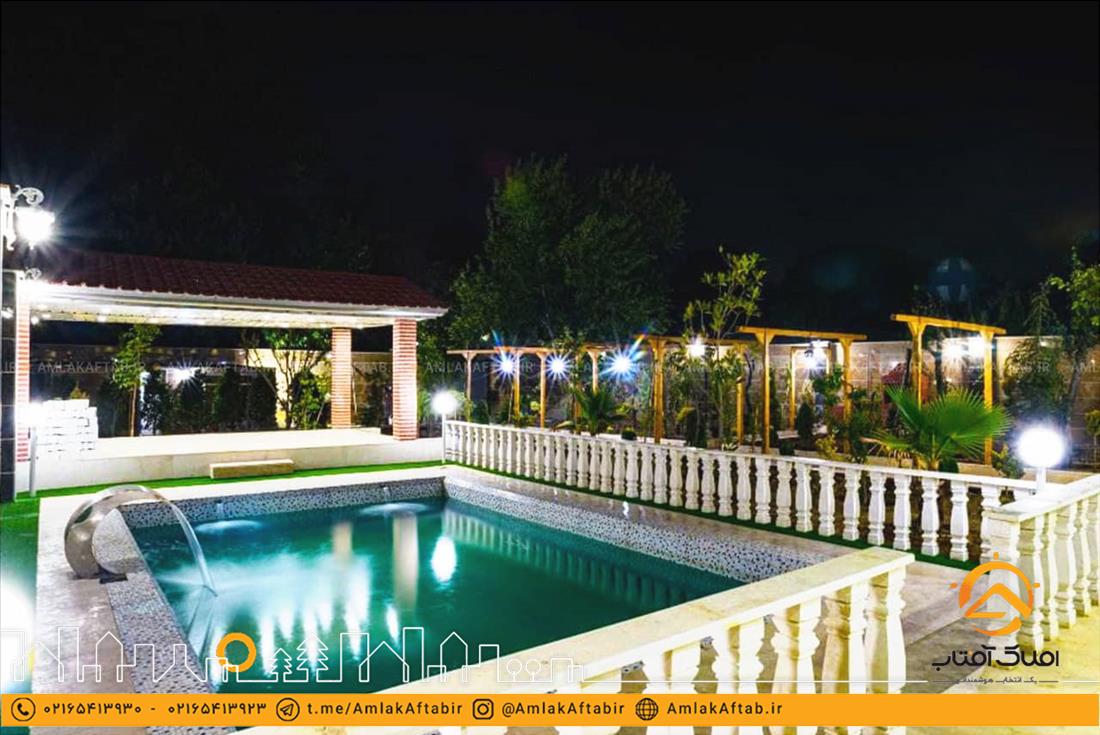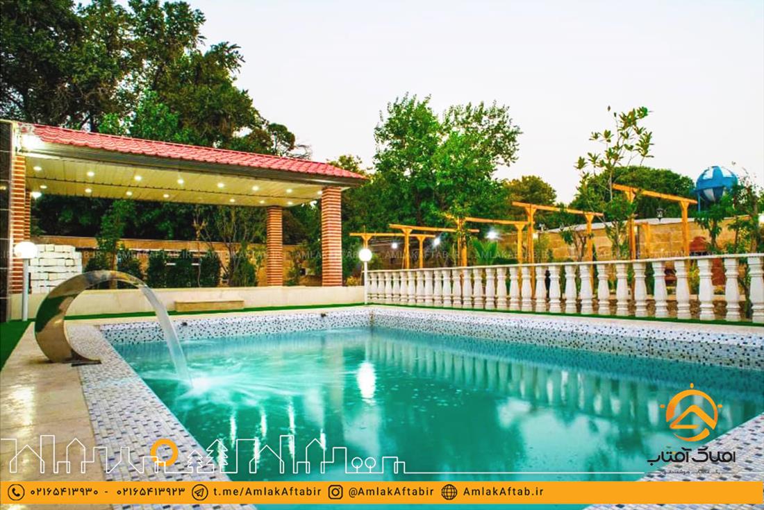 از دیگر امکانات این باغ ویلا لوکس می توان به استخر چهار فصل اشاره کرد که دارای تصفیه خانه و ماساژور می باشد. فضاسازی و محوطه سازی و همچنین نورپردازی بینظیر و فوق العاده زیبایی در این ملک انجام شده که چشم انداز خاصی را بخصوص در شب به ارمغان می آورد. در مجاورت استخر یک آلاچیق بزرگ ساخته شده که بسیار کاربردی می باشد. همچنین در فضای باغ باربیکیو نیز قرار گرفته که دارای روشویی نیز می باشد.